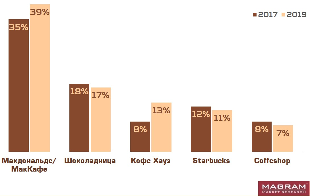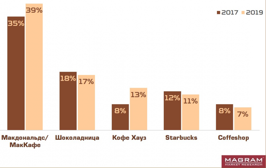 Большинство тех, кто предпочитает пить кофе на ходу, покупает его в сетевых кофейнях, которые за полтора года даже увеличили свою долю: 66% и 60%, соответственно. Не изменилась и пятерка наиболее популярных сетевых заведений, но вот динамика у них — разная.