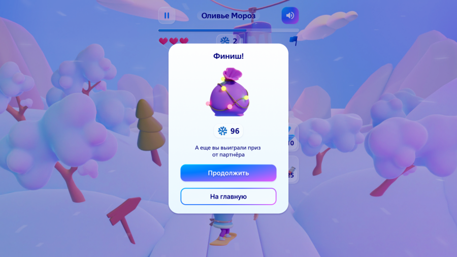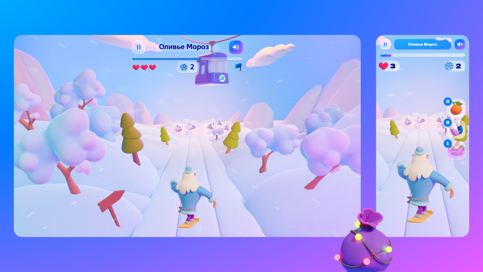 Итак, игрокам предстояло, управляя Дедом Морозом, мчаться по склонам, уворачиваться от препятствий и собирать снежинки, бустеры и мешки с подарками, чтобы покорить вершину рейтинга и выиграть ценные призы. Снежинки — это очки опыта, суммарное количество которых влияло на позицию в рейтинге. А за собранный мешок с подарками начислялся реальный денежный приз от партнеров ВТБ в конце игры.
