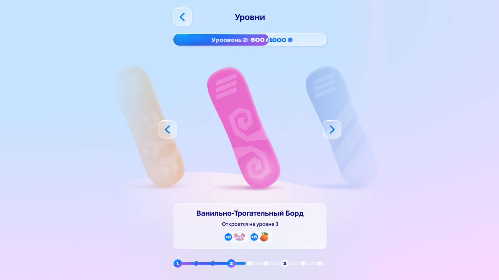 Всего в игре их 5. Накапливая очки опыта, пользователь поэтапно открывает 5 уникальных сноубордов — каждый обновляет экипировку персонажа и дает дополнительные награды для улучшения игрового процесса. Например, за 2 730 очков открывался ВТБ-борд, 2 дополнительные попытки, 2 бустера «Магнит» и 2 бустера «Турбо двигатель».