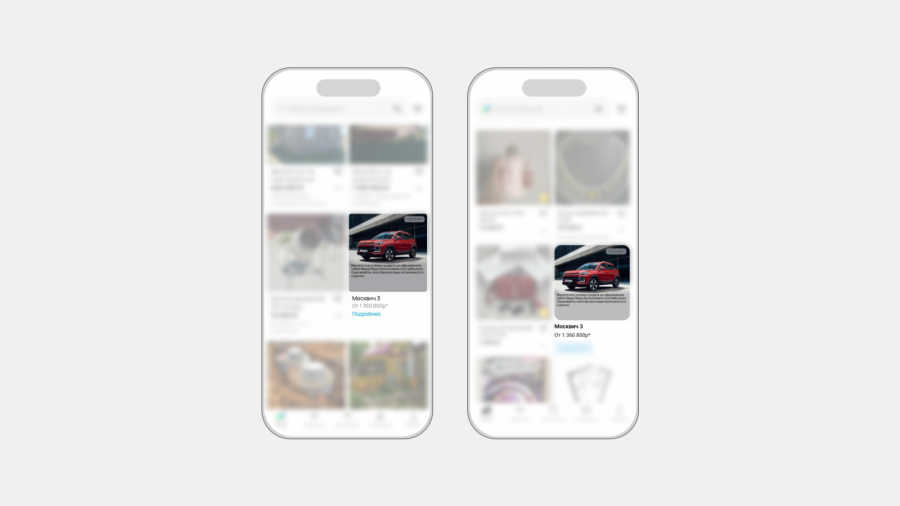 В качестве основного выбрали нативный формат: он похож на обычные объявления, которые размещаются на «Авито», встраиваются в ленту онлайн-площадки и становятся органичной частью ее основного контента. При нажатии на такие баннеры пользователи переходили из «Авито» на сайт бренда с объектом рекламирования — моделью «Москвич 3».