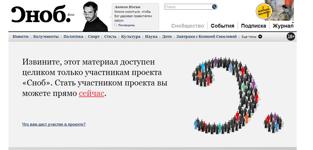 Проект «Сноб» решил ограничить доступ к публикациям на сайте. Материалы будут доступны только членам клуба, сообщил главный редактор Николай Усков.