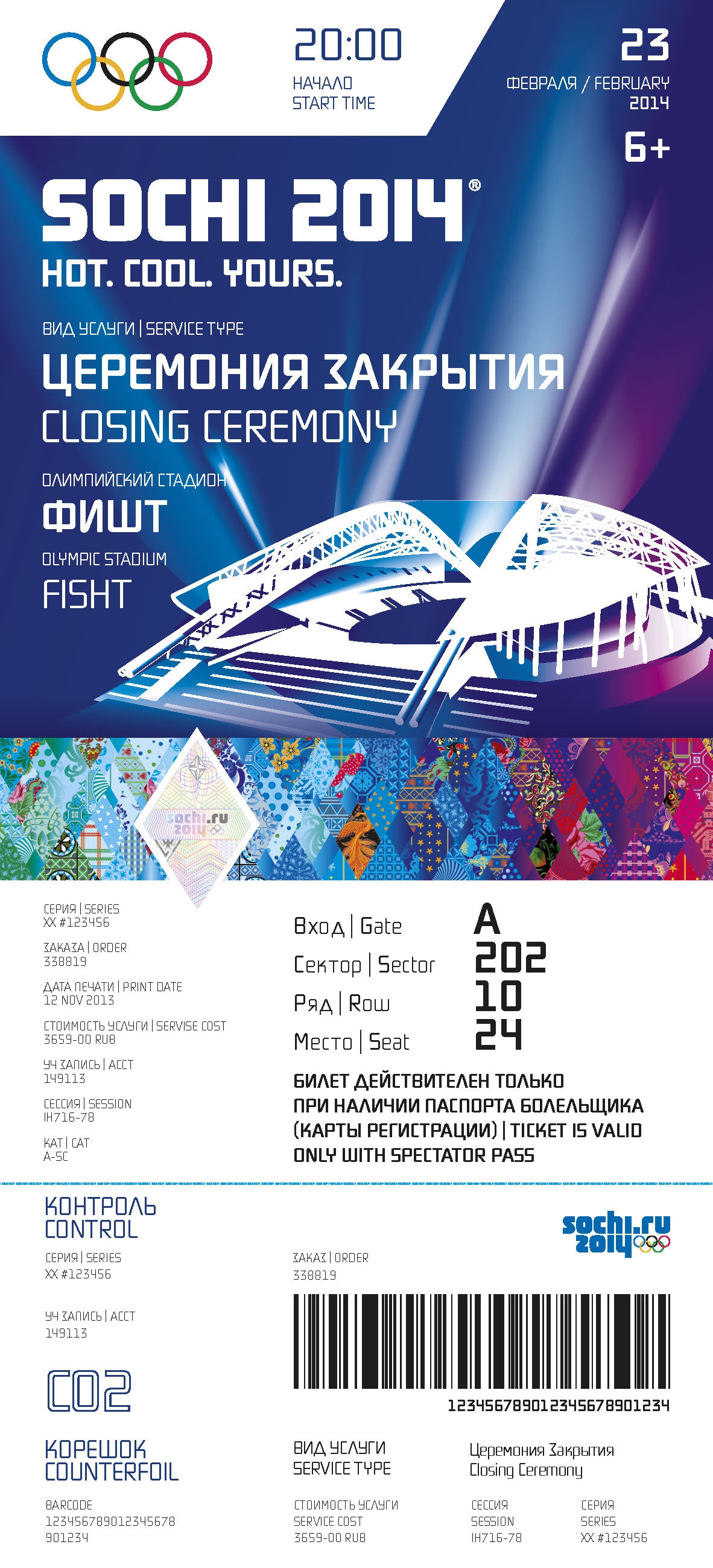 На лицевой стороне сувенирного билета помимо пиктограммы указаны название объекта и дисциплина, на которую куплен билет, нанесен олимпийский символ – пять колец, словесное обозначение (вордмарк) «Sochi 2014» и слоган зимних Игр в Сочи на английском языке – «Hot. Cool. Yours». Аналогичное обозначение на русском языке – «Сочи 2014» и слоган «Жаркие. Зимние. Твои.» напечатаны на оборотной стороне билета.