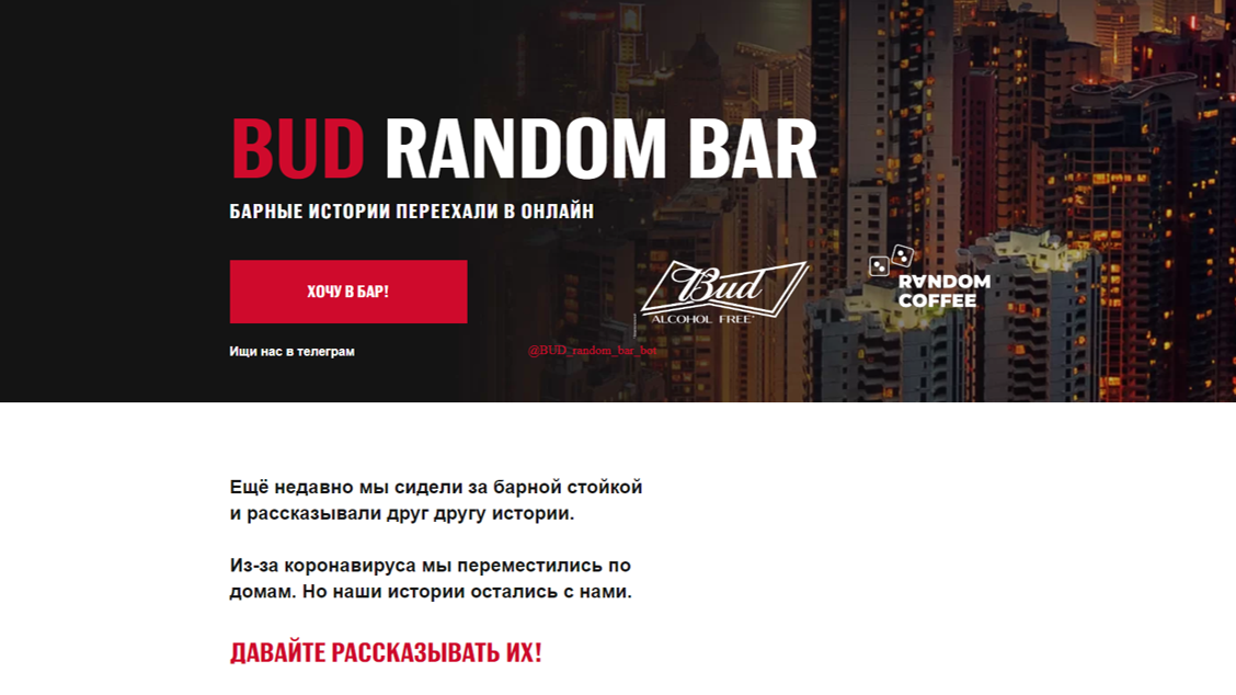 Мы просто очень верили в эту идею, а потом случился локдаун. Мы с клиентом поняли, что настало время действовать, и ждать больше нельзя. В целом COVID стал хорошим катализатором всех процессов, которые раньше зрели бы очень долго. У нас появился серьезный повод задуматься о том, как CRM должен существовать для FMCG-бренда. Так в ответ на актуальный для пользователя запрос родился Bud Random Bar, ставший инновационным каналом, через который можно донести ценности бренда до его аудитории и воплотить в жизнь основную цель — объединять людей, делая мир лучше. Мы осознанно остановились на идее с баром и комнатами, поскольку видели, что у аудитории на это есть спрос. Онлайн-бары создавал каждый пятый, но никто особо не парился по поводу наполнения, в итоге все Zoom-вечеринки превращались в достаточно хаотичный опыт для пользователя.