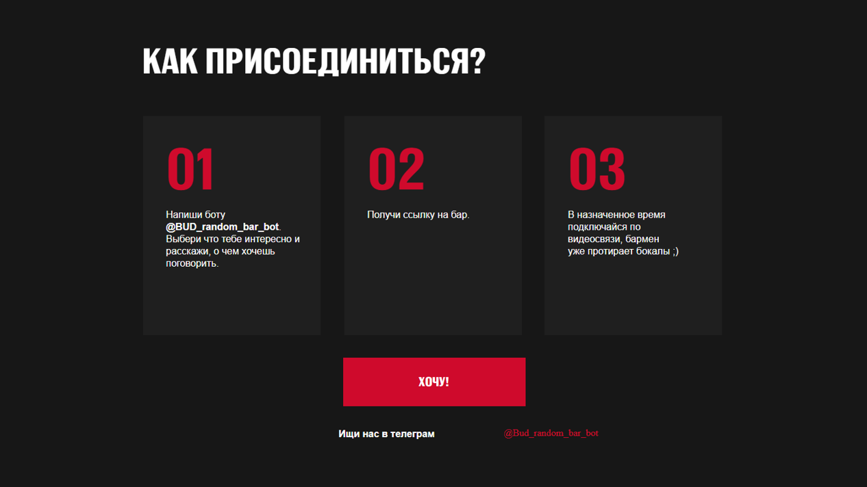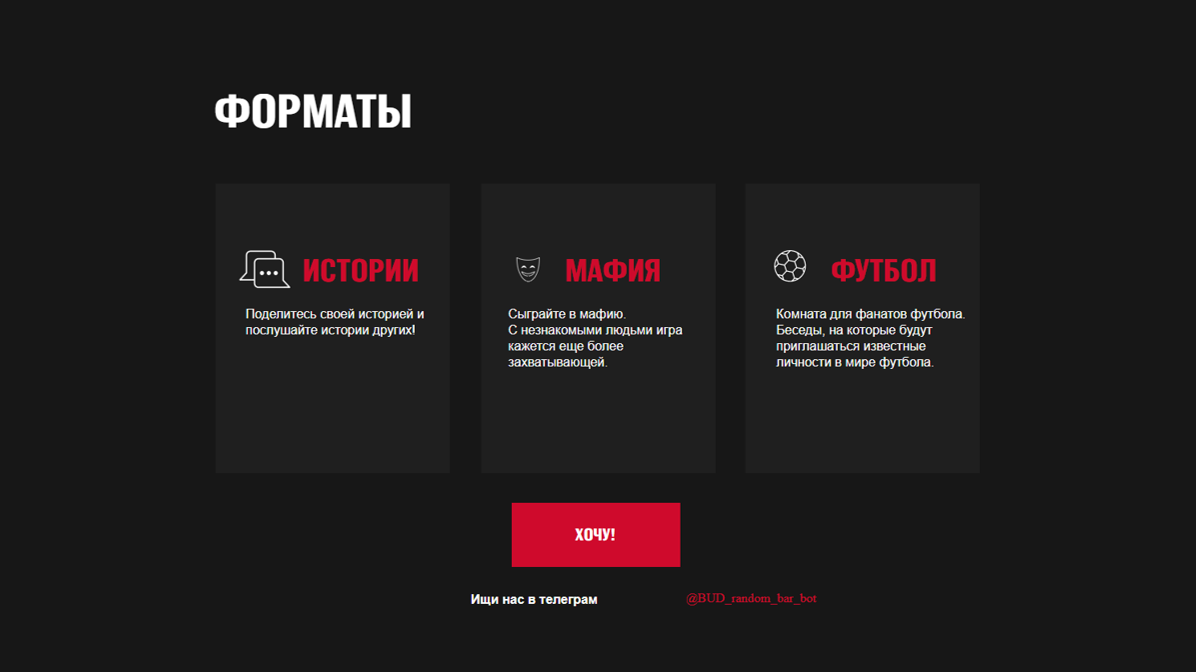 Мы же поставили цель создать не бар, а нечто большее — уникальное пространство, в котором каждый мог найти единомышленников и стать ближе к настоящим креаторам. Совместно с командой Random Coffee мы разработали лендинг и чат-бот, который собирает людей в группы и приглашает на встречу в Zoom или Whereby. Там можно было рассказать историю, поиграть в мафию, а иногда и попасть в комнату с селебрити или обсудить футбол с известным футбольным комментатором.