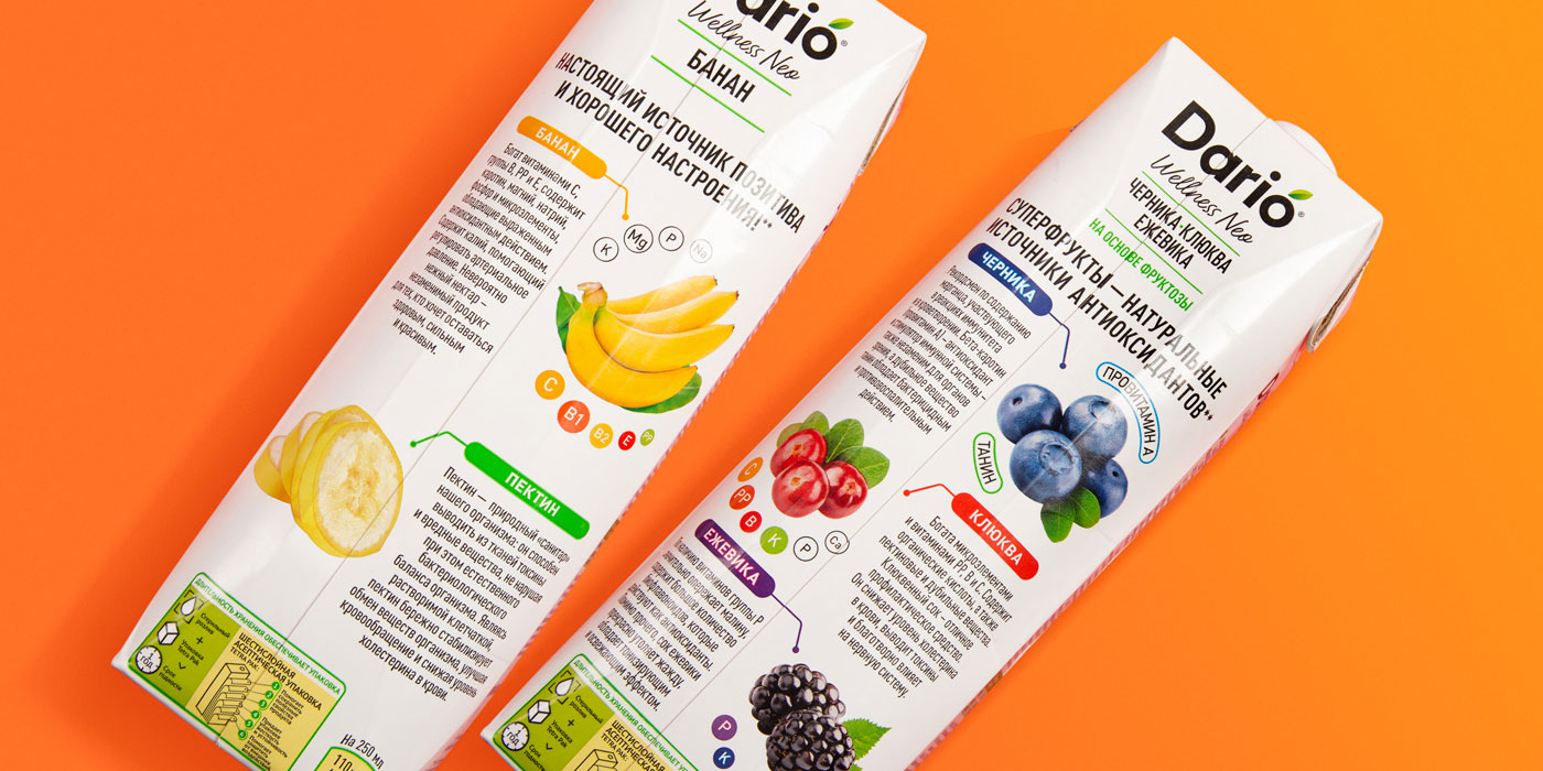 Новый логотип, размещенный в верхней части упаковки, стал более современным и лаконичным. В основной линейке Dario Wellness буква D, сохранив свою узнаваемую форму, трансформировалась в полукруглую плашку-окно, в которой теперь лучше считываются фрукты/овощи, входящие в состав продукта.