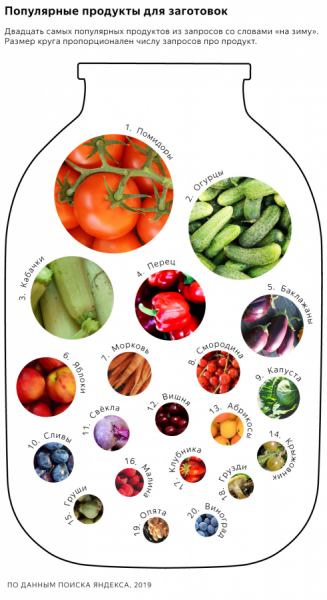 В топ-20 в порядке убывания попали болгарский перец, баклажаны, яблоки, морковь, смородина, капуста, сливы, свекла, вишня, абрикосы, крыжовник, груши, малина, клубника, грузди, опята и виноград. Лук и чеснок, как правило, упоминаются в запросах как дополнительные ингредиенты.