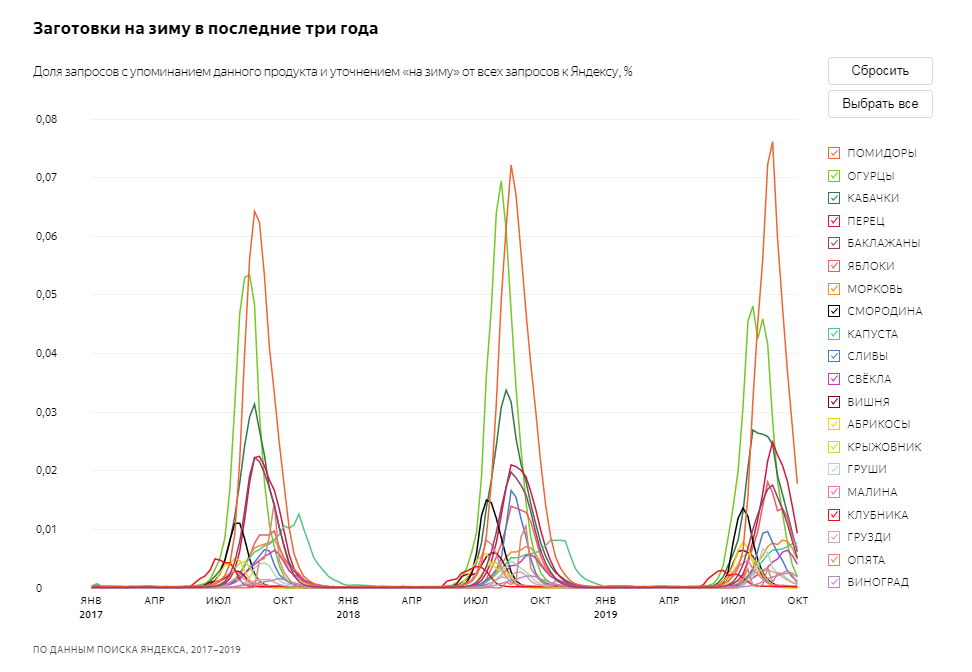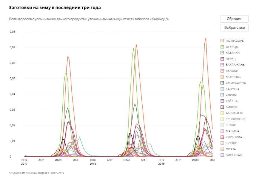 В компании отметили, что в 2019 году интерес к заготовкам был примерно на 7% ниже, чем в прошлом: из-за холодного лета в центральной части России этот год был не таким урожайным. Более чем на 15% процентов упала доля «зимних» кулинарных запросов, касающихся огурцов, баклажанов, смородины и клубники. Зато россияне чаще спрашивали про заготовку груздей (+32%) и цветной капусты (+28%). На четверть выросла доля крыжовника и апельсинов.