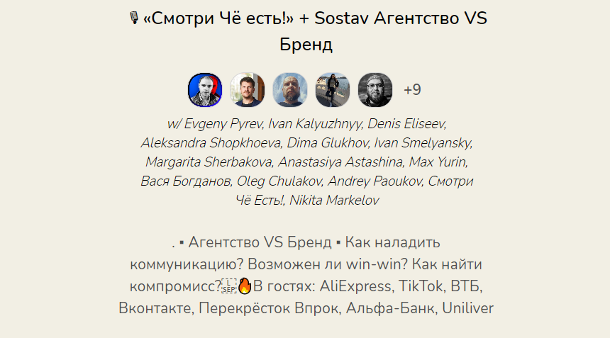 А в 18:30 вместе с каналом «Смотри Чё есть!» и его ведущим Евгением Пырьевым, совладельцем и креативным продюсером FABULA creative agency, мы проведем «очную ставку» агентствам и брендам, чтобы в горячей дискуссии выяснить пути достижения компромисса в их отношениях, а также узнать, возможно ли прийти в них к win-win. Помогут в этом разобраться спикеры «комнаты»: