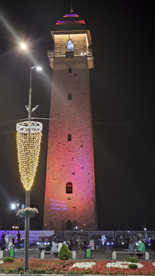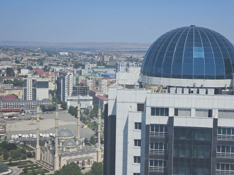 С 32 этажа видна большая красивая мечеть — «Сердце Чечни». На крыше одна из сторон ограждена красной лентой и табличкой «Не снимать». Следит за этим специальный человек, окидывая каждого внимательным тяжелым взглядом. За лентой вид на запретную для съемок зону — резиденцию Рамзана Кадырова.