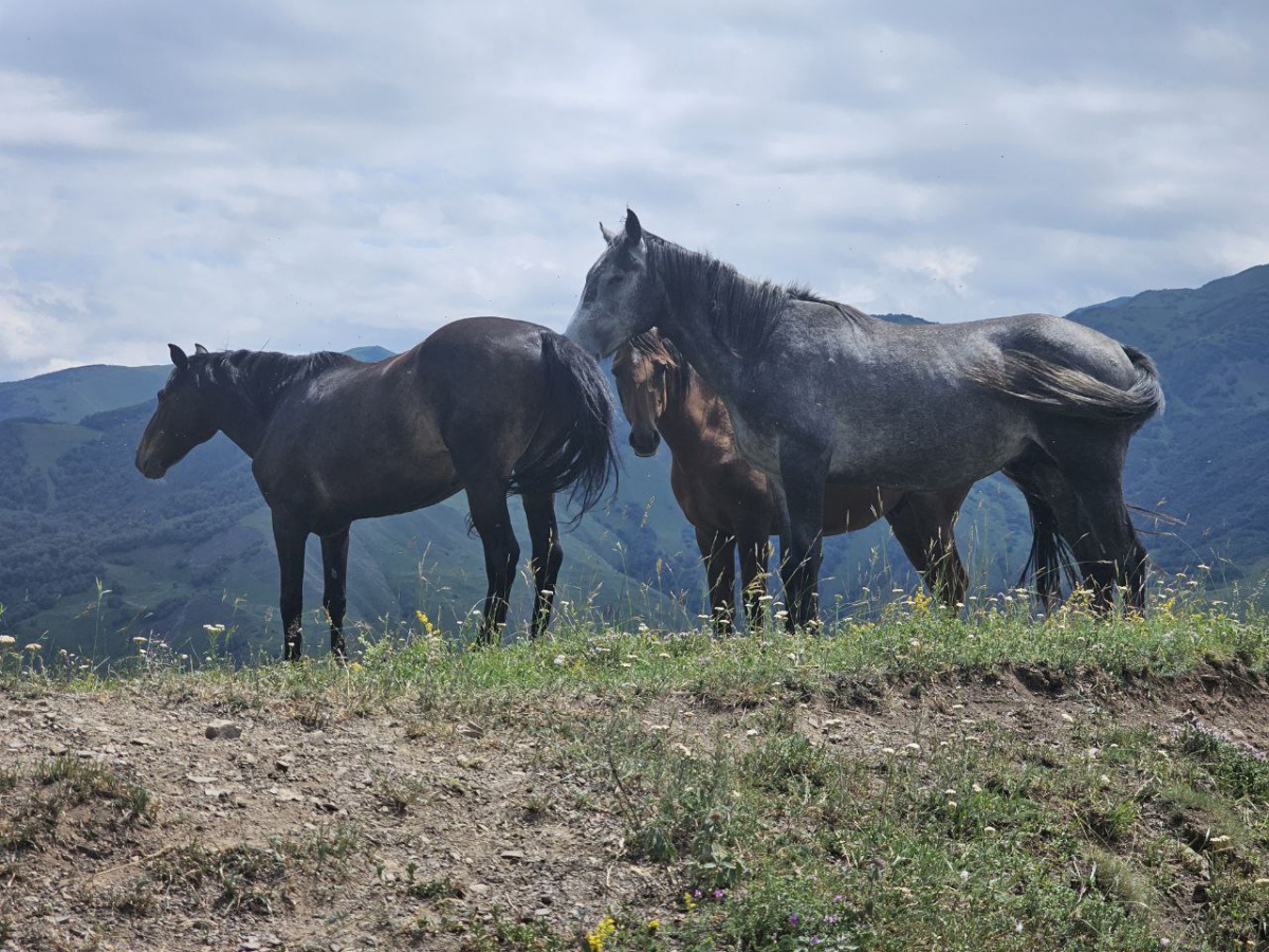 По дороге один из джипов ломается, и мы опять застреваем на трассе. Девчонок пересаживают в новую машину, но и хватает на полчаса. Чуть позже видим худосочных коров, лошадей и овец. Зеленые долины — летнее пастбище. К зиме животных вернут в сельские стойла. Не выдерживаю и прошу остановиться. Лошади — это святое. Делаю фотографии и не сразу замечаю, как передо мной открылся Шаройский архитектурный комплекс. Множество башен и прочей национальной архитектуры.