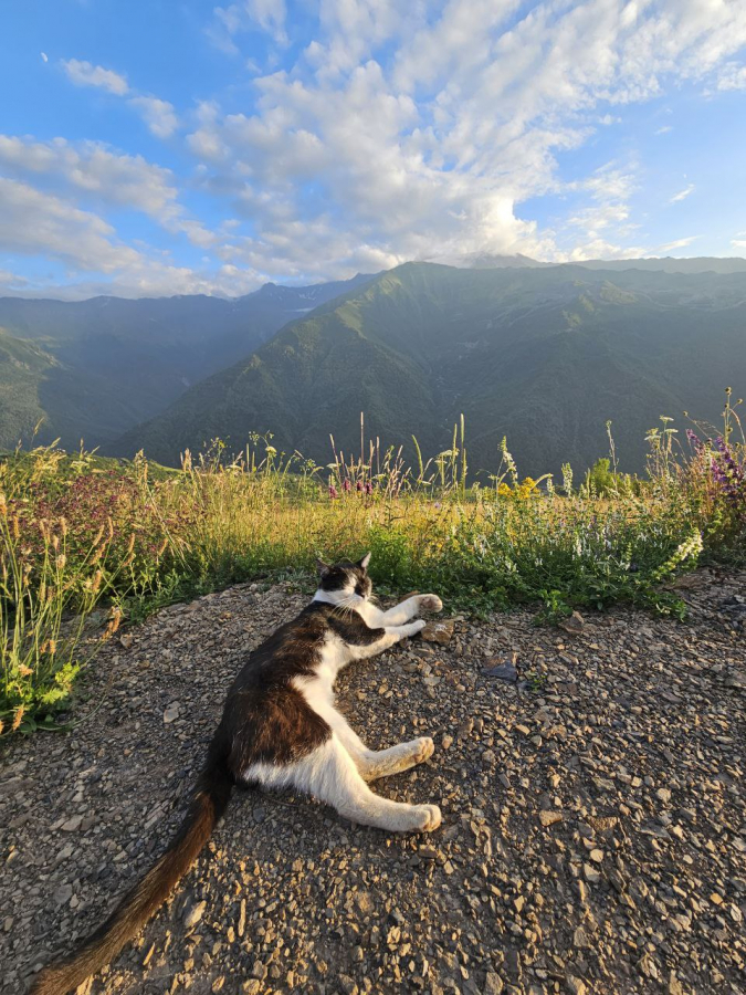 Так и не разобравшись, отправляемся на прогулку по горной экотропе. За нами, истерически мяукая, бежит черно-белый кот. Не дождавшись еды, он гордо следует за нами, высоко подняв хвост. Журналисты не могут удержаться от фотографий — кот кайфует от обилия внимания.