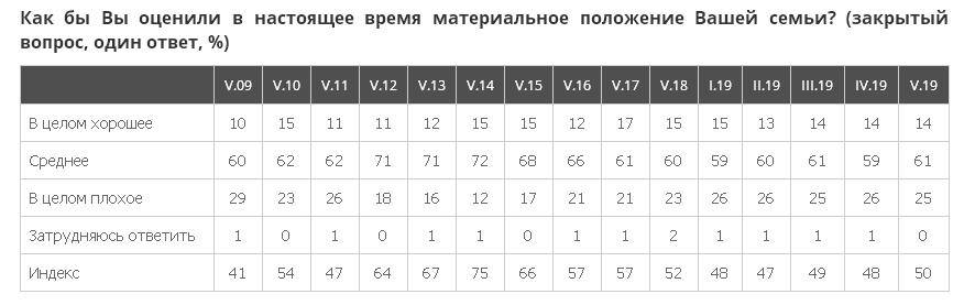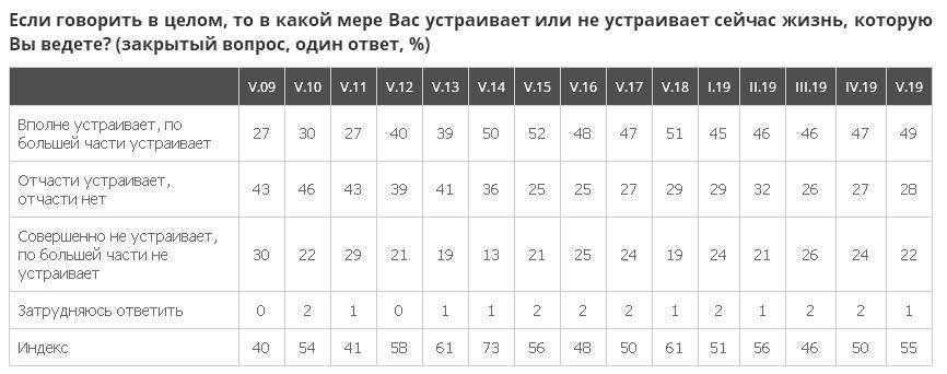 Оценки материального положения семьи немного прибавили: 61% респондентов назвал материальное положение их семьи средним. Еще четверть назвали его плохим, 14% — выше среднего. Уровень удовлетворенности жизнью после апрельского снижения в мае восстановил позиции, составив 55 п. О том, что жизнь их в целом устраивает, говорят 49%, об обратном — 28%.