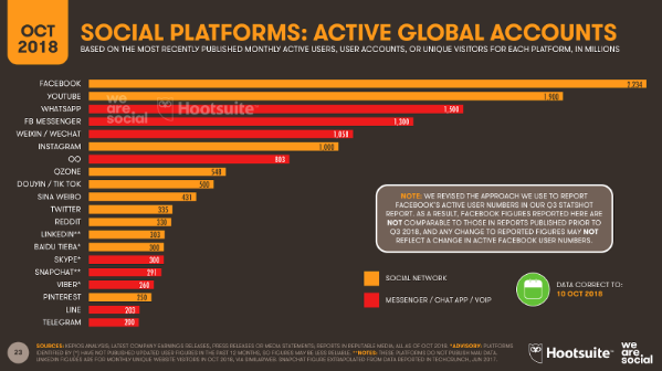 В рейтинге SimilarWeb — четыре социальных платформы (Facebook, Twitter, Instagram и «ВКонтакте»), у Alexa — шесть (к уже упомянутым добавляются Reddit и китайский проект Weibo). Крупнейшей остается Facebook, на второе место Hootsuite и We Are Social ставят YouTube, на третье — WhatsApp.