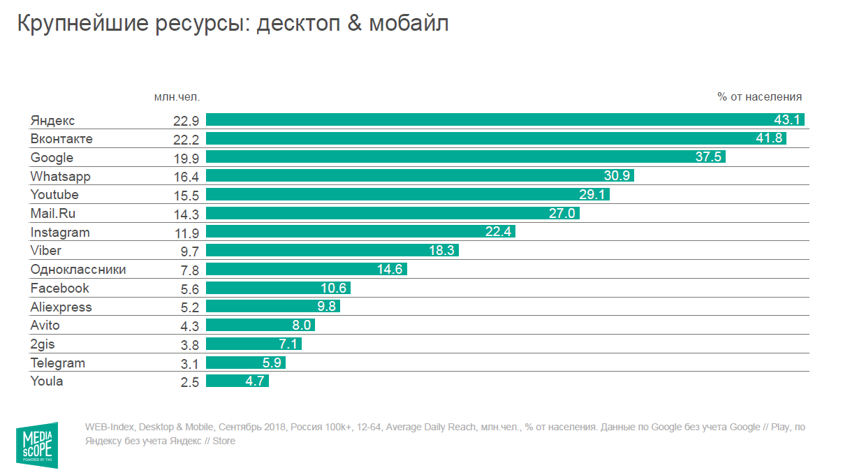В России главные социальные платформы — это «ВКонтакте», WhatsApp, YouTube, Instagram, Viber, «Одноклассники», Facebook и Telegram, свидетельствуют данные Mediascope Web-Index. В сентябре дневная аудитория «ВКонтакте» составляла 22,2 млн человек, или 42% населения (12−64, города с населением 100k+, десктоп+мобайл).