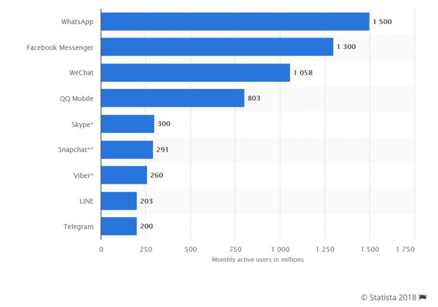 Примечательно, что замыкает двадцатку Telegram с 200-миллионной активной аудиторией и вообще почти половина TOP 20 приходится на мессенджеры, чат- и VOIP-сервисы: помимо WhatsApp и Telegram это FB Messenger, WeChat, ∞, Skype, Snapchat, Viber и Line.