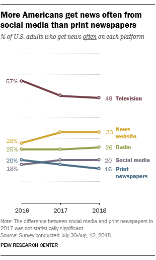 В США, как показывает исследование Pew Research Center, социальные медиа являются четвертым по значимости источником новостной информации — после телевидения, новостных сайтов и радио. Для россиян основным источником информации выступают новостные, аналитические и официальные сайты, на втором месте находится телевидение, на третьем — социальные сети и блоги. Уровень доверия к блогам и соцсетям по сравнению с 2017 годом снизился на 1 п.п.