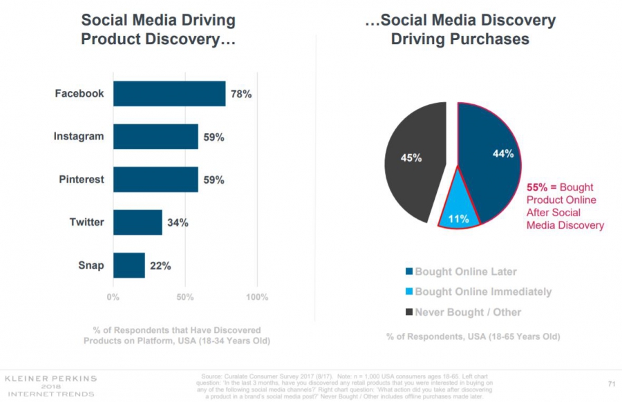 Социальные сети стали важным источником знаний о продуктах. Большая часть открытий совершается в Facebook, Instagram и Pinterest, при этом 55% пользователей покупают заинтересовавший их товар онлайн — немедленно или после некоторых раздумий.