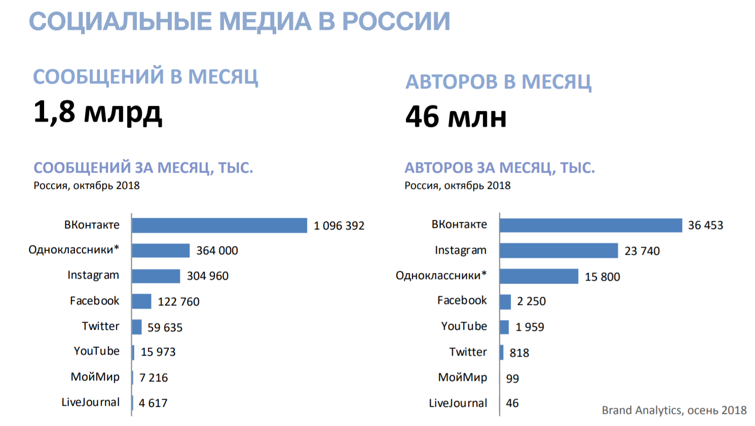 По числу сообщений и активных (пишущих) пользователей в России лидируют «ВКонтакте», «Одноклассники» и Instagram. За последний год количество авторов в социальных медиа увеличилось почти на 30% — с 35 млн до 46 млн, говорится в исследовании Brand Analytics. Контента же генерится почти в три раза больше — 1,8 млрд сообщений в месяц против 625 млн в 2017 году.