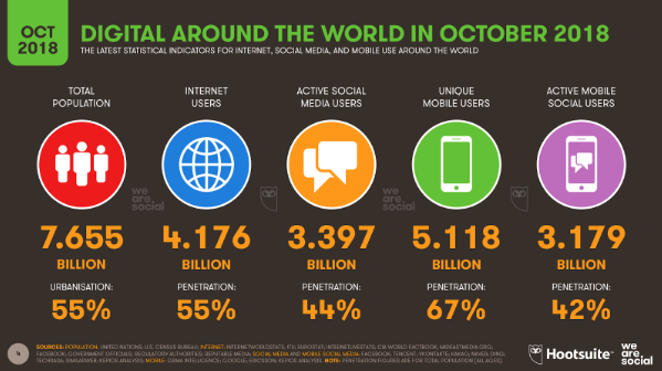 Активной аудиторией социальных сетей является 44% глобальной интернет-аудитории, которая насчитывает почти 4,2 млрд человек. За год в соцсетях зарегистрировалось 320 млн пользователей, то есть темпы роста составили 10%.