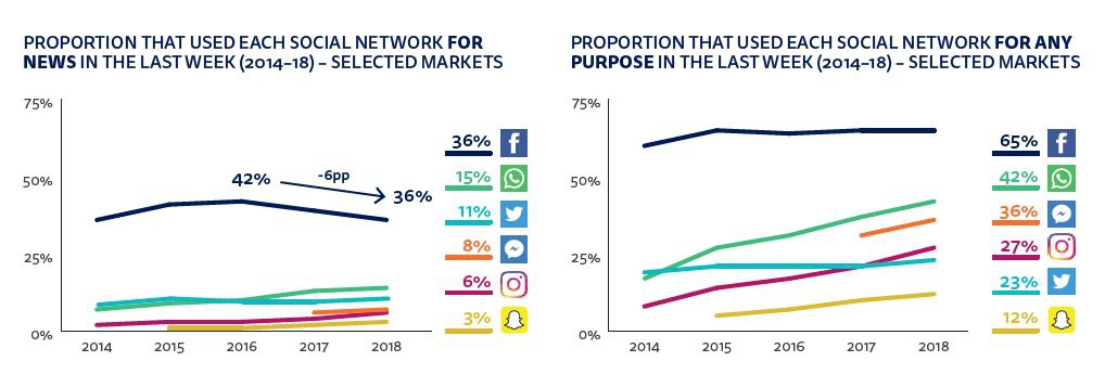 Аналитики наблюдают охлаждение к соцсетям и агрегаторам как к каналам распространения. Институт изучения журналистики Reuters в своем Digital News Report отмечает, что пользователи перестают рассматривать Facebook как новостную площадку (42% — в 2016 году, 36% — в 2017-м).