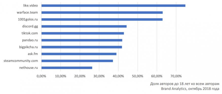 В России к трендовым видеоблогингу и стримингу добавился тренд мобильных социальных видеоплатформ. like.video лидирует по доле авторов младше 18 лет, также огромной популярностью пользуется игровая тематика — в топ самых молодежных ресурсов входят три геймерских: warface.team, steamcommunity.com, discord.gg. Доля молодежи у pandao.ru выше, чем у aliexpress.com.