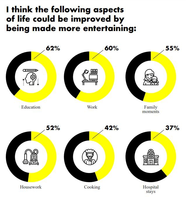 Продвинутые пользователи уверены, что элемент развлечения можно привнести в любую сферу жизни. Согласно исследованию Havas Group, больше всего развлекательная составляющая востребована в образовании (62%), работе (60%), семейном времяпрепровождении (55%), домашних делах (52%), при приготовлении пищи (42%) и пребывании в больнице (37%).