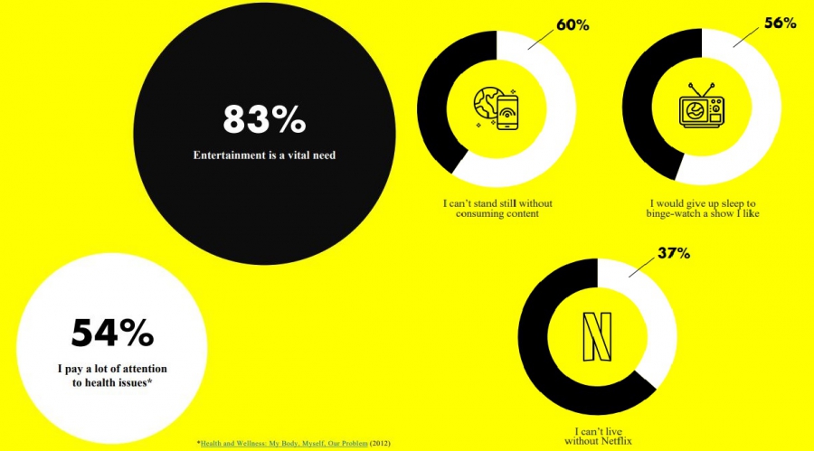 Потребность развлекаться не является для людей чем-то наносным, для них это насущная необходимость. Просьюмеры думают о развлечениях даже больше, чем о собственном здоровье. Жизнь без возможности погрузиться в другую реальность становится невыносимой. Так, 60% респондентов не выдержат жизни без потребления контента, 56% пожертвуют сном ради просмотра любимого шоу, а 37% не смогут жить без Netflix.
