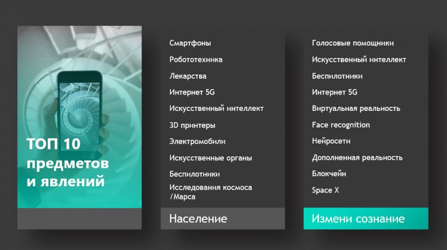 Самыми прорывными технологиями последних 2−3 лет жители России назвали смартфоны, робототехнику, лекарства, интернет 5G, искусственный интеллект, 3D принтеры, электромобили, искусственные органы, беспилотники, а также исследования космоса и Марса. Участники «Измени сознание» выбрали голосовые помощники, искусственный интеллект, беспилотники, интернет 5G, виртуальную реальность, face recognition, нейросети, AR, блокчейн и Space X.