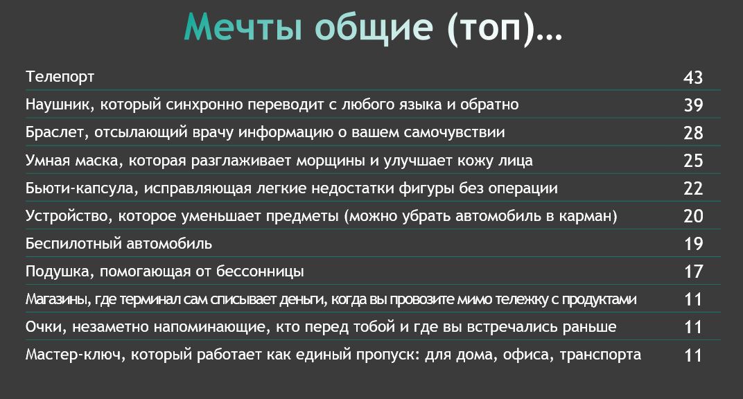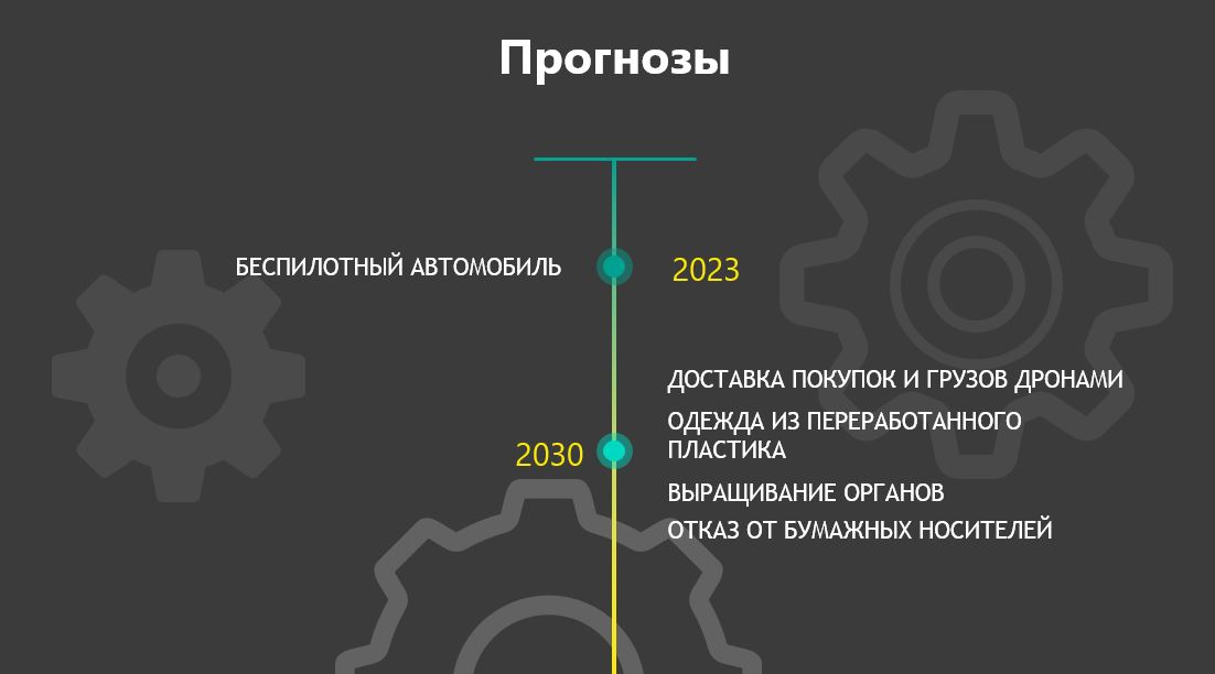 К 2030 году россияне ожидают массового распространения беспилотных автомобилей, доставки посылок с помощью дронов, одежды из переработанного пластика, выращенных человеческих органов и полного отказа от бумажных носителей. Более половины опрошенных считает, что гаджеты будут встраиваться в одежду, а еще около четверти респондентов думает, что устройства будут по-прежнему носить в кармане или же вживлять в организм. При этом больше всего россияне мечтают о появлении телепорта, устройства для синхронного перевода любых языков и медицинского браслета, который сам передавал бы врачам информацию о самочувствии человека.