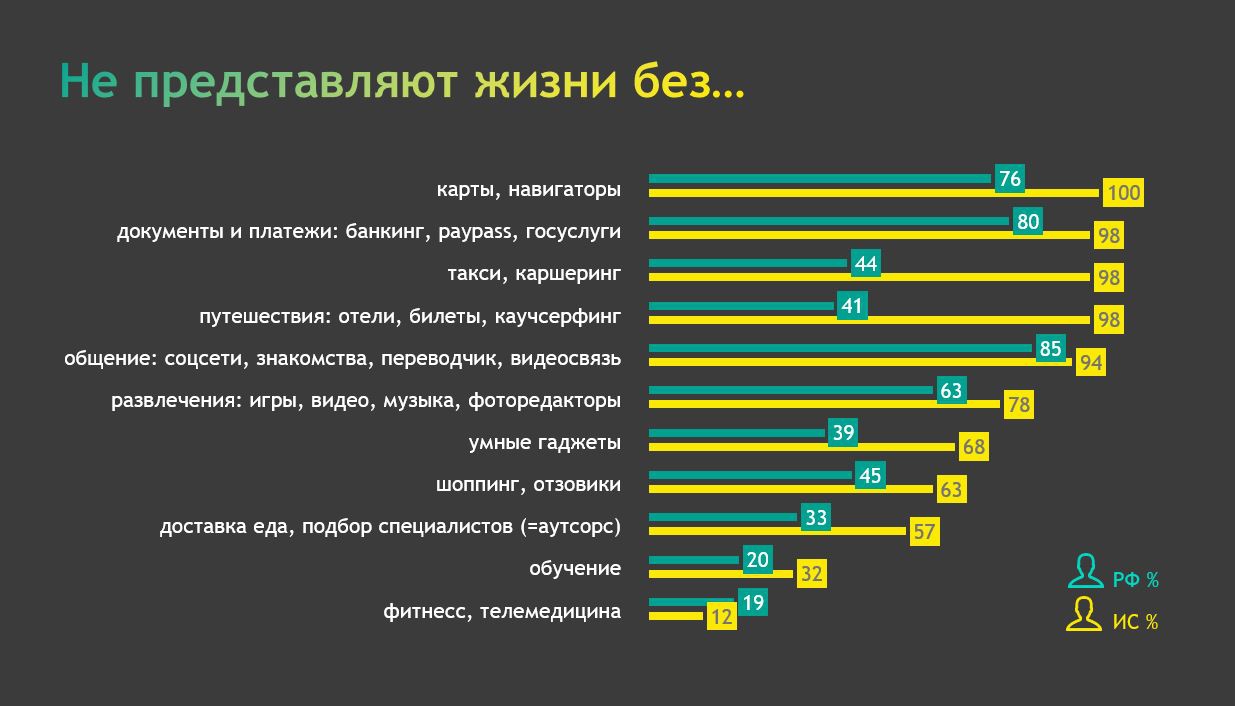 Российские пользователи, по данным Mediascope, не представляют жизнь без сервисов для общения (социальных сетей, дейтинг-проектов, переводчиков, видеосвязи), инструментов для платежей и документооборота (банкинга, платежей paypass и госуслуг), а также геолокационных приложений (карт и навигатора). Далее следуют развлечения (игры, видео, музыка, фоторедакторы), шопинг, транспорт (такси, каршеринг) и путешествия.