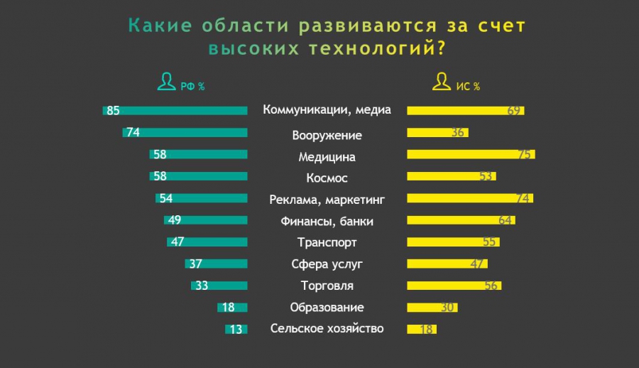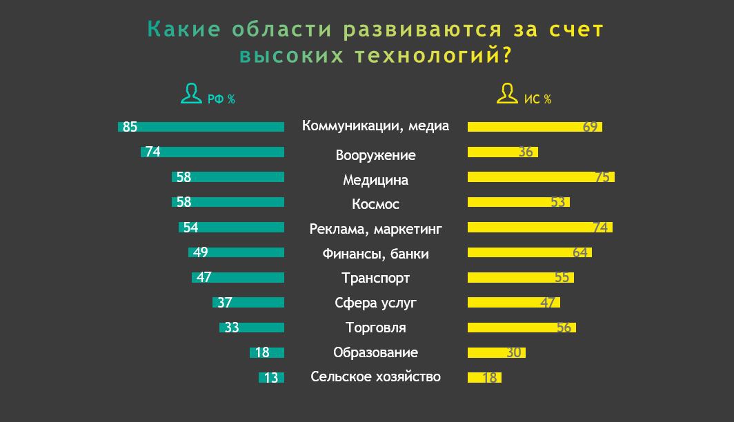 Быстрее всего, по мнению российских респондентов, технологии развиваются в медиа и коммуникациях (85%), вооружении (74%), медицине и космосе (58%), а также рекламе и маркетинге (54%). Особых технологических изменений россияне не видят в сельском хозяйстве, образовании, торговле и сфере услуг.