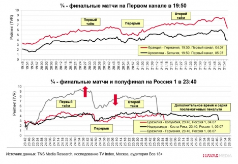 «Серия голов добавила около 10% аудитории первому тайму. Мы полагаем, их привлекли сообщения новостных лент и звонки уже смотрящих. Однако эта аудитория не осталась на второй тайм и матч досмотрели скорее те, кто начал смотреть его с самого начала, а какая-то часть изначальной аудитории уже пошла спать, догадываясь о том, что все же пройдет в финал», – комментируют аналитики Havas Media.