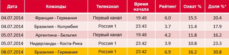 Полуфинальный матч Бразилия-Германия на ЧМ-2014, прошедший в ночь с 8 на 9 июня, по телесмотрению оказался выше самого популярного в 1/4 финала – матча Франция-Германия в пятницу, 4 июня, однако разница по рейтингам и охвату составила менее 1 %.