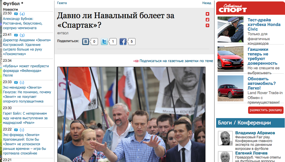 Sports.ru отказало в размещении заказного материала, однако буквально на следующий день подобная статья была опубликована в «Советском спорте» под заголовком «Давно ли Навальный болеет за «Спартак»?». При этом материал вышел без пометки «на правах рекламы» и без указания автора.