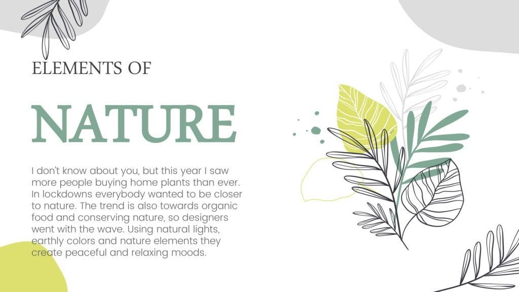 Сейчас явно стало больше людей, покупающих домашние растения, чем когда-либо. В самоизоляции все хотели быть ближе к природе. Также развивается тенденция к органическим продуктам питания и сохранению природы. Дизайнеры пошли на поводу этих желаний. Используя естественное освещение, натуральные цвета и элементы природы, они создают умиротворяющую и расслабляющую атмосферу.