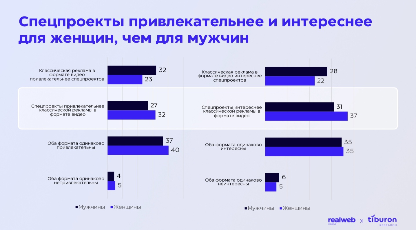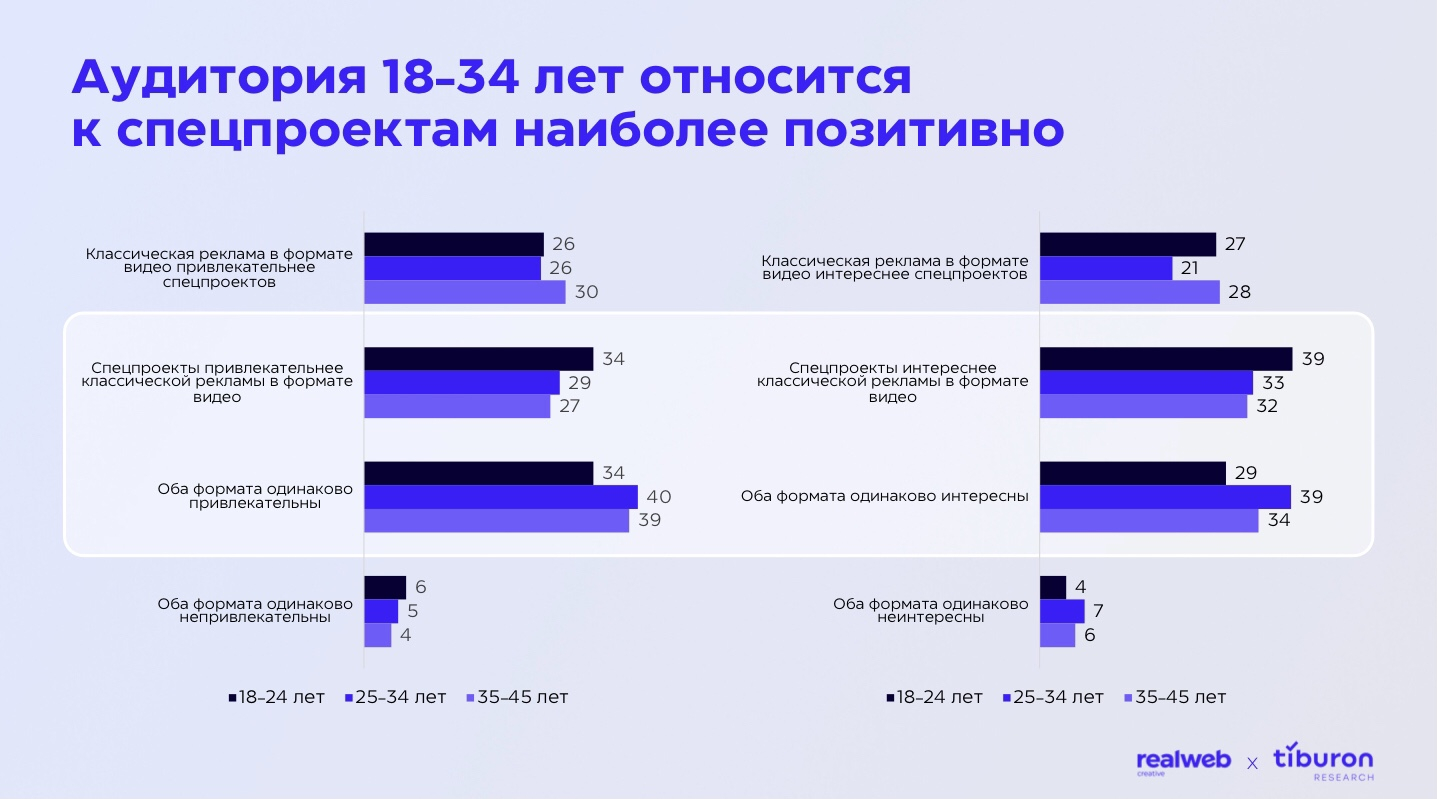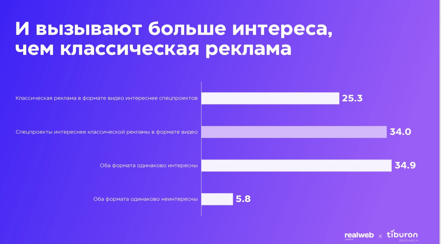 34% опрошенных отметили, что формат спецпроектов их привлекает больше, чем формат классической рекламы через видео, за этот вариант проголосовало 25%. Ещё 34,9% заявили, что оба формата одинаково интересны.