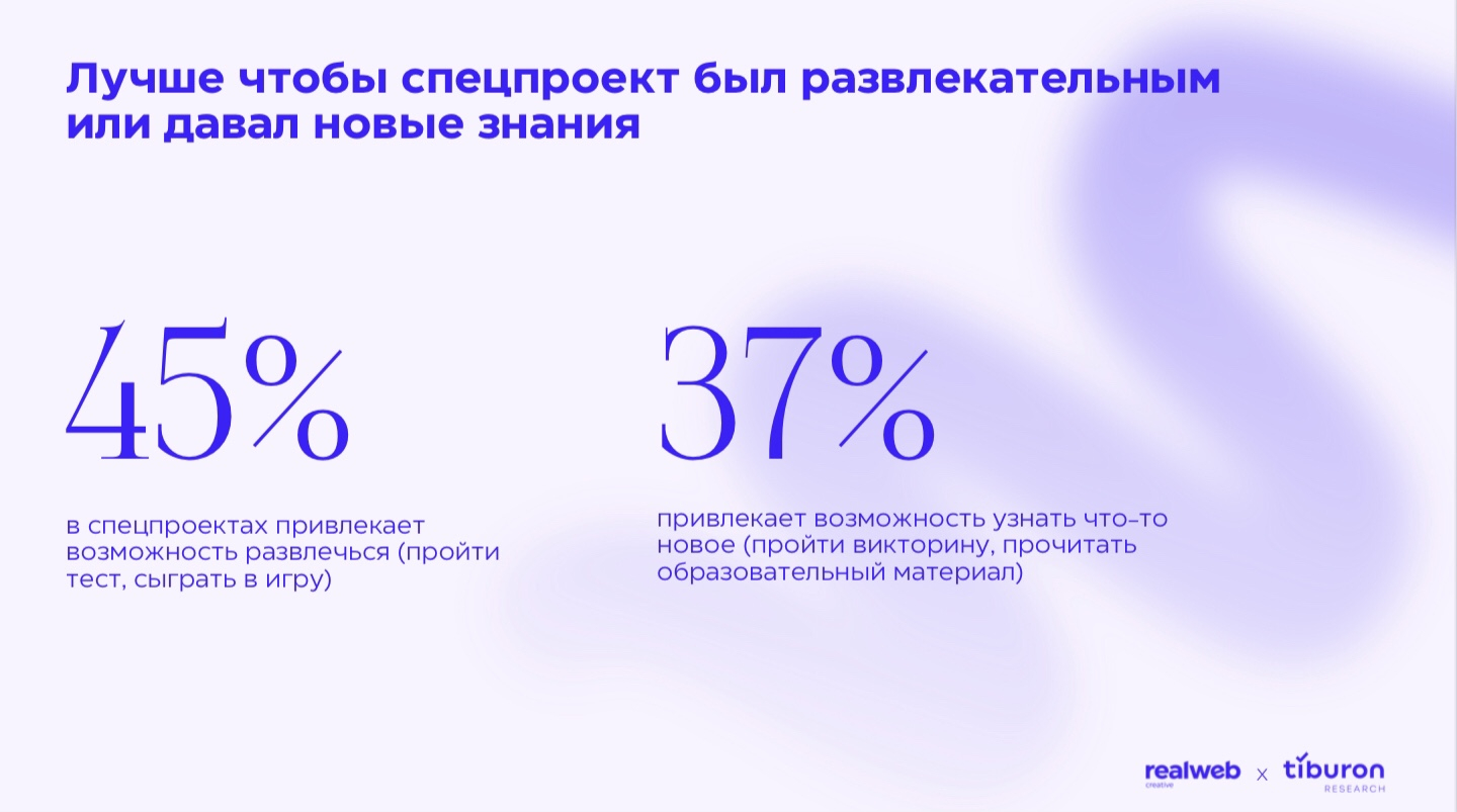 45% россиян в спецпроектах привлекает возможность развлечься — пройти тест, принять участие в игре или посмотреть развлекательный контент.