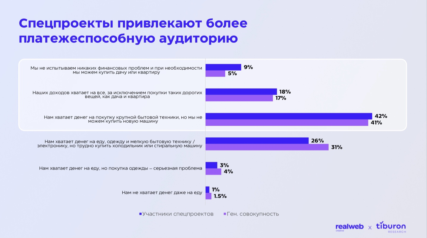 Согласно исследованию, спецпроекты чаще привлекают более платёжеспособную аудиторию — тех, кому хватает денег на покупку крупной бытовой техники.