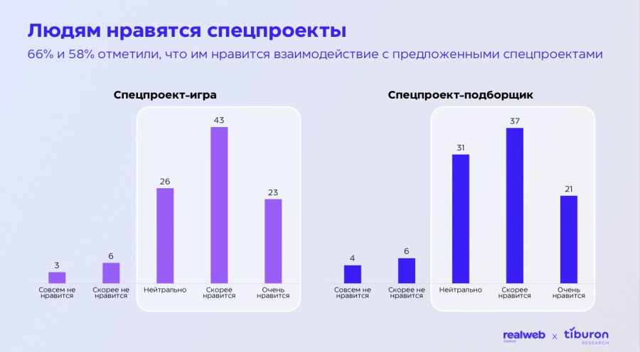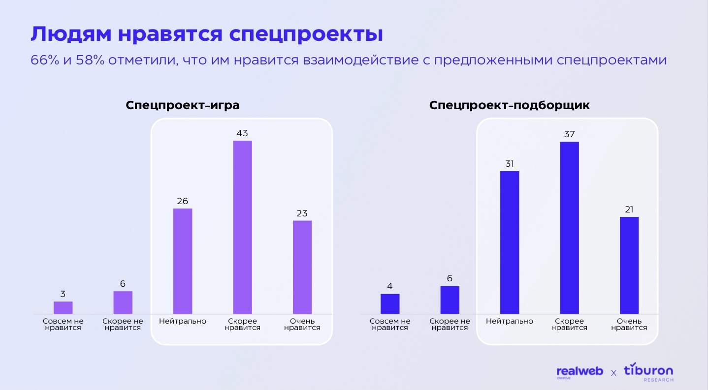 66% респондентов нравится взаимодействие со спецпроектами-играми, 58% — со спецпроектами-подборщиками.