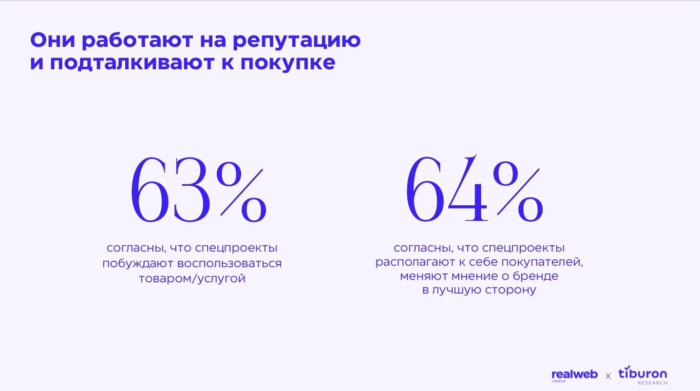 64% респондентов заявили, что спецпроекты располагают к себе покупателей, меняют мнение о бренде в лучшую сторону. 63% опрошенных считают, что спецпроекты побуждают людей воспользоваться товаром или услугой.