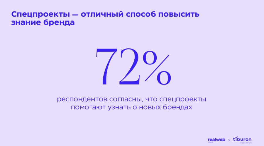 72% росиян согласны, что спецпроекты помогают узнать о новых брендах. Об этом говорится в исследовании Realweb Creative и Tiburon Research.