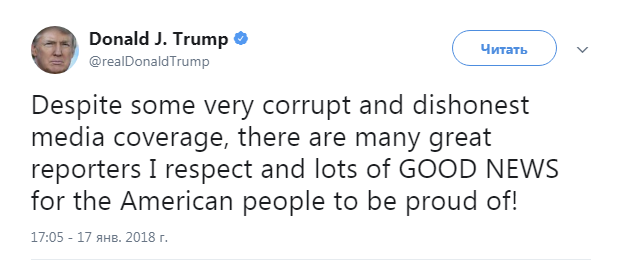 В Twitter Трамп прокомментировал свой рейтинг: «Несмотря на некоторые продажные и нечестные СМИ, я уважаю многих журналистов. Существует множество хороших новостей для американцев, которыми они могут гордиться!».