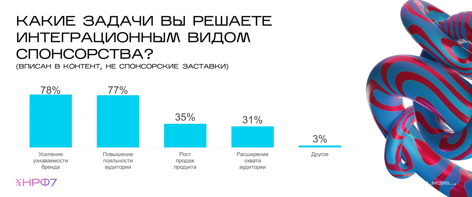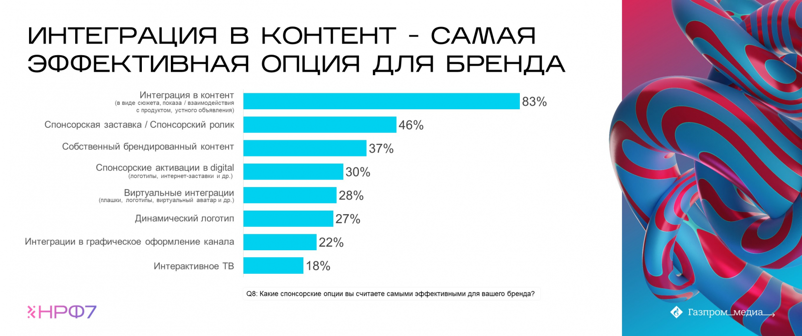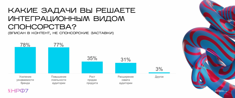 По мнению рекламодателей, интеграция в контент и спонсорская заставка — самые эффективные опции. Почти 80% респондентов с помощью интеграционного формата повышают узнаваемость бренда и укрепляют лояльность аудитории. Треть рекламодателей отмечает, что размещение внутри телеконтента помогает наращивать продажи.