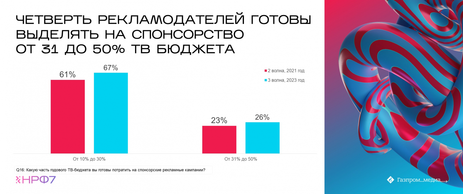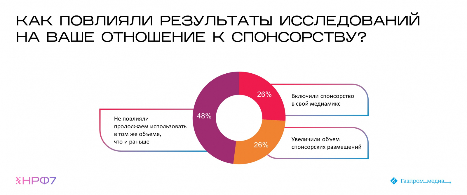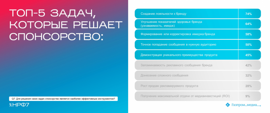 Еще одной важной задачей исследования было выявить, влияет ли осведомленность о показателях эффективности спонсорства на рост инвестиций рекламодателей. Результаты опроса показали, что, познакомившись с данными первой и второй волн индустриального исследования, 26% респондентов нарастили объем спонсорских размещений.