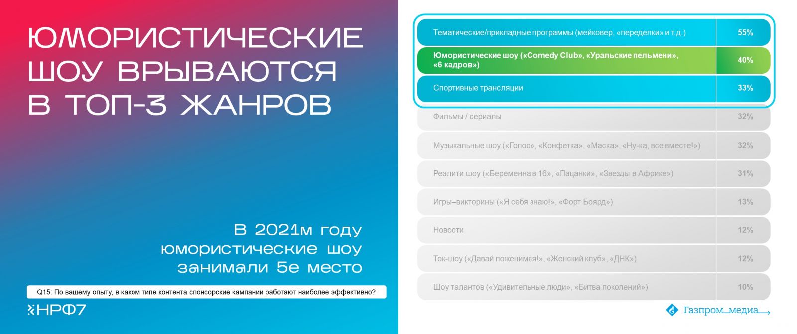 Наиболее эффективными, с точки зрения возможностей размещения, остаются развлекательные телеканалы. Тематические и прикладные программы наиболее эффективны для 55% рекламодателей. Юмористические шоу поднялись на вторую позицию (40%) среди лучших жанров в рамках спонсорства на ТВ. Спортивные трансляции выбрали 33% респондентов. Они опередили с небольшим разрывом фильмы и сериалы (32%), музыкальные шоу (32%) и реалити-шоу (31%).