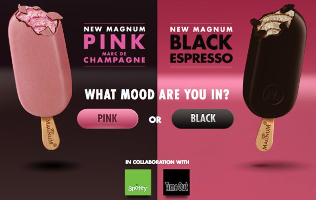 Magnum, бренд корпорации Unilever, в партнерстве с журналом Time Out и музыкальным сервисом Spotify запустил сразу два новых сервиса в рамках рекламной кампании мороженого Magnum Pink и Magnum Black. Оба проекта сосредоточены на изучении разных сторон личности человека в зависимости от его настроения.
