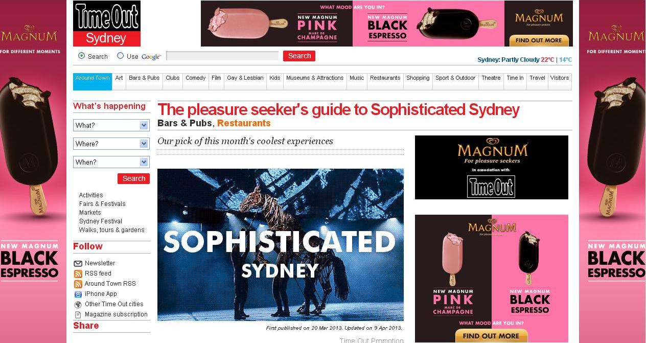 Еще один новый проект Magnum, созданный в партнерстве с Time Out, - «Гид искателя наслаждений». Сервис предлагает гостям и жителям пяти крупнейших городов Австралии (Сидней, Мельбурн, Аделаида, Брисбен и Перт) подборку кафе, ресторанов и событий, атмосфера которых соответствует «розовому» или «черному» настроению пользователя.