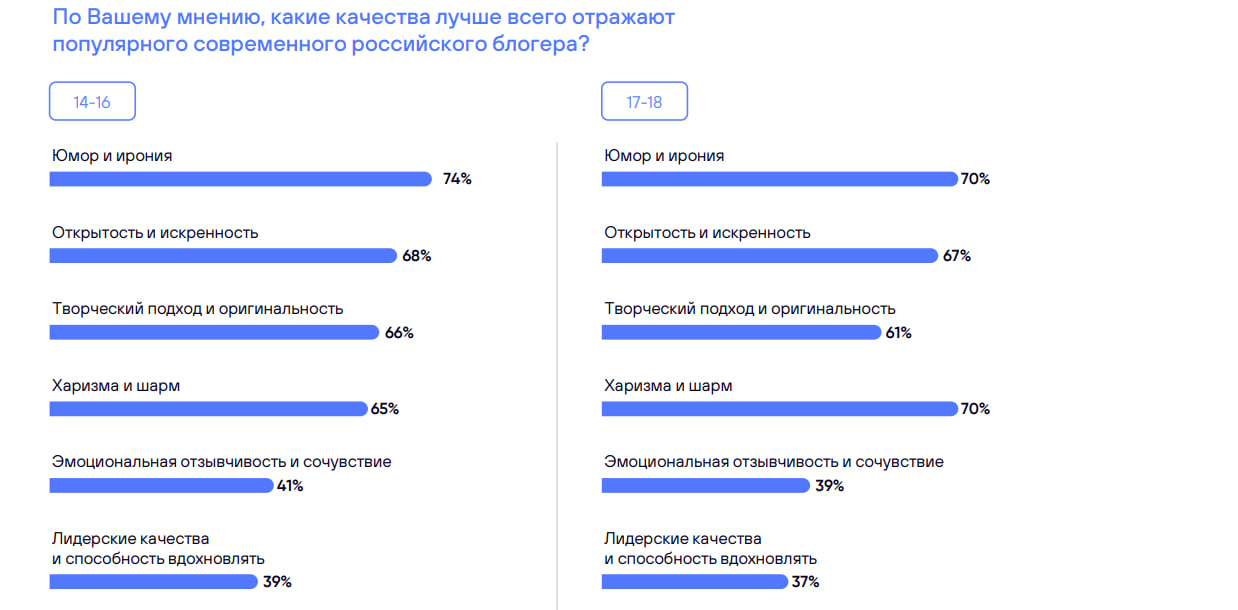 Такое качество, как открытость и искренность отмечают 68% в группе «14−16 лет» и 67% среди 17−18-летних. Творческий подход и оригинальность российских блогеров чаще замечают «молодые» подростки — 66% против 61% в «старшей» группе. Зато взрослые выделяют харизму и шарм (70% против 65%).