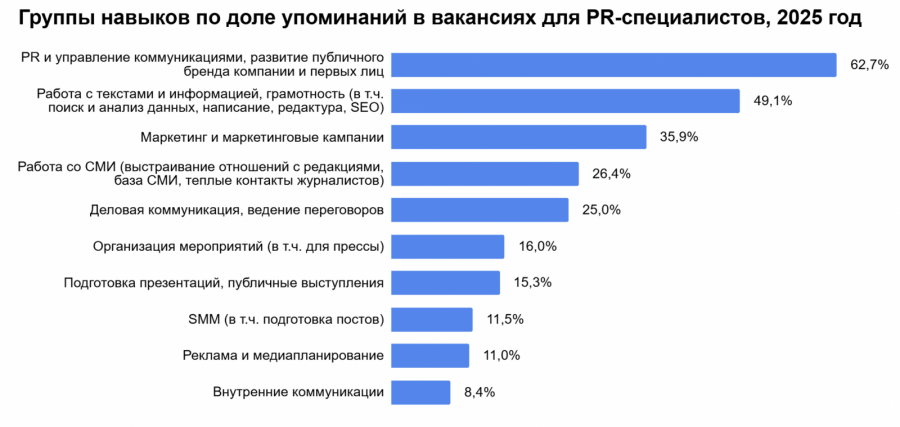 Согласно анализу вакансий, размещенных на hh.ru, в топ-5 навыков, которыми должен обладать PR-специалист, чтобы успешно претендовать на вакансии, по итогам 2025 года вошли: PR и управление коммуникациями, развитие публичного бренда компании и первых лиц (группа навыков упоминается в 63% вакансий), работа с текстами и информацией, грамотность (49%), маркетинг и маркетинговые кампании (36%), работа со СМИ (26%) и деловые коммуникации (25%).