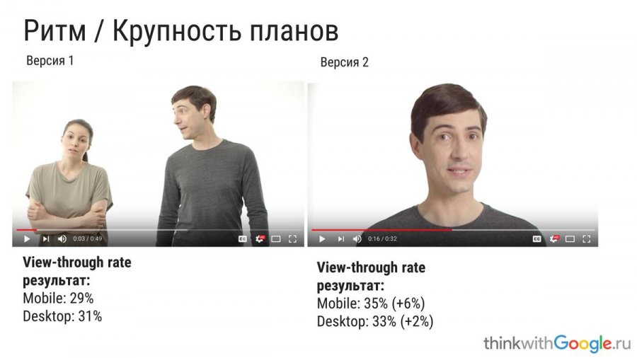 Наши эксперименты показывают, что высокий темп ролика и крупные кадры улучшают его показатели, в том числе и в рекламе — «агрессивный» монтаж приводит к 15% росту метрик.